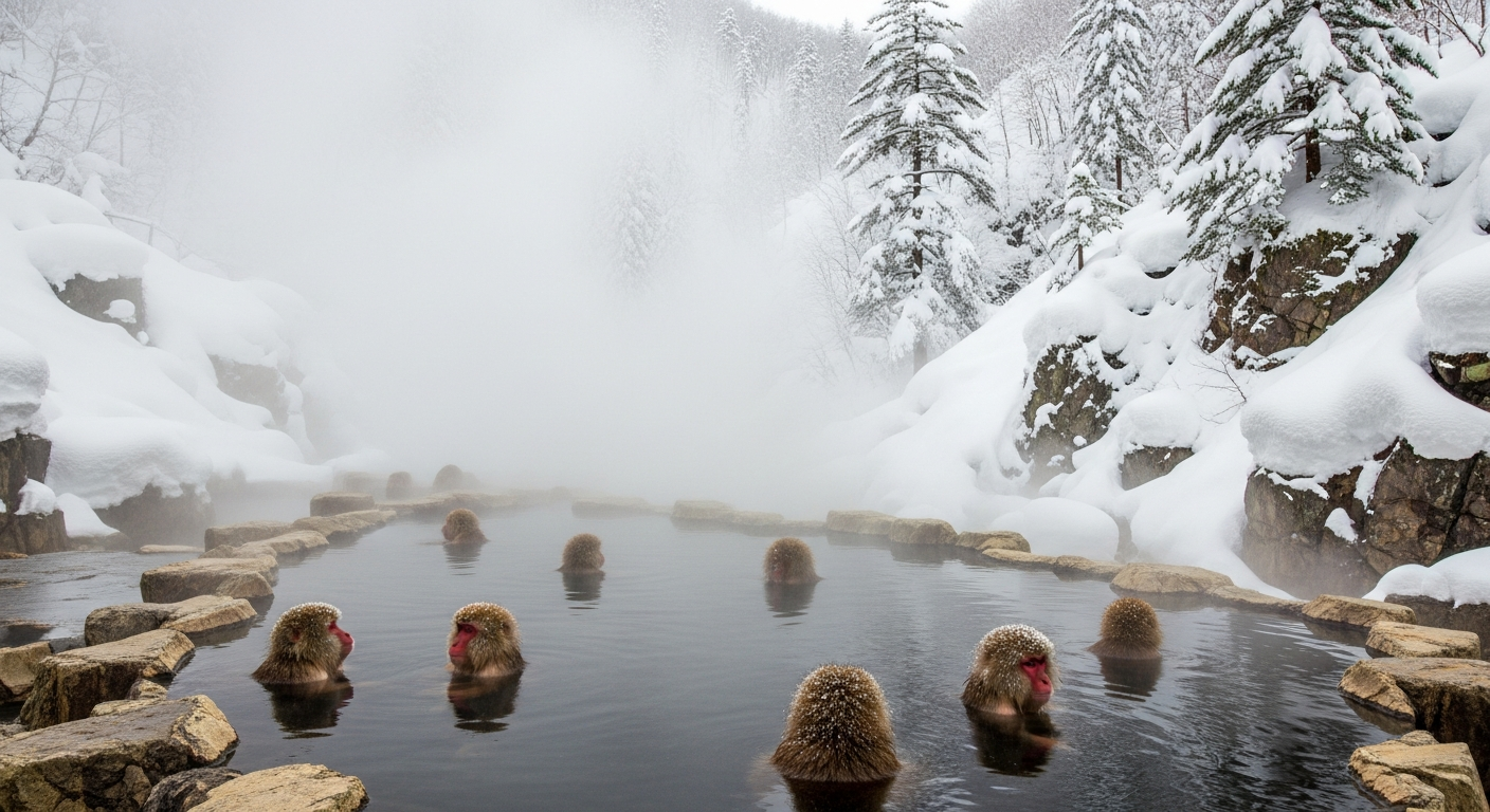Reisen Sie tief in die Japanischen Alpen, um wilde Makaken beim Baden in natürlichen heißen Quellen zu beobachten. Ein unvergessliches Winterphänomen, das im Jigokudani Monkey Park einzigartig ist.